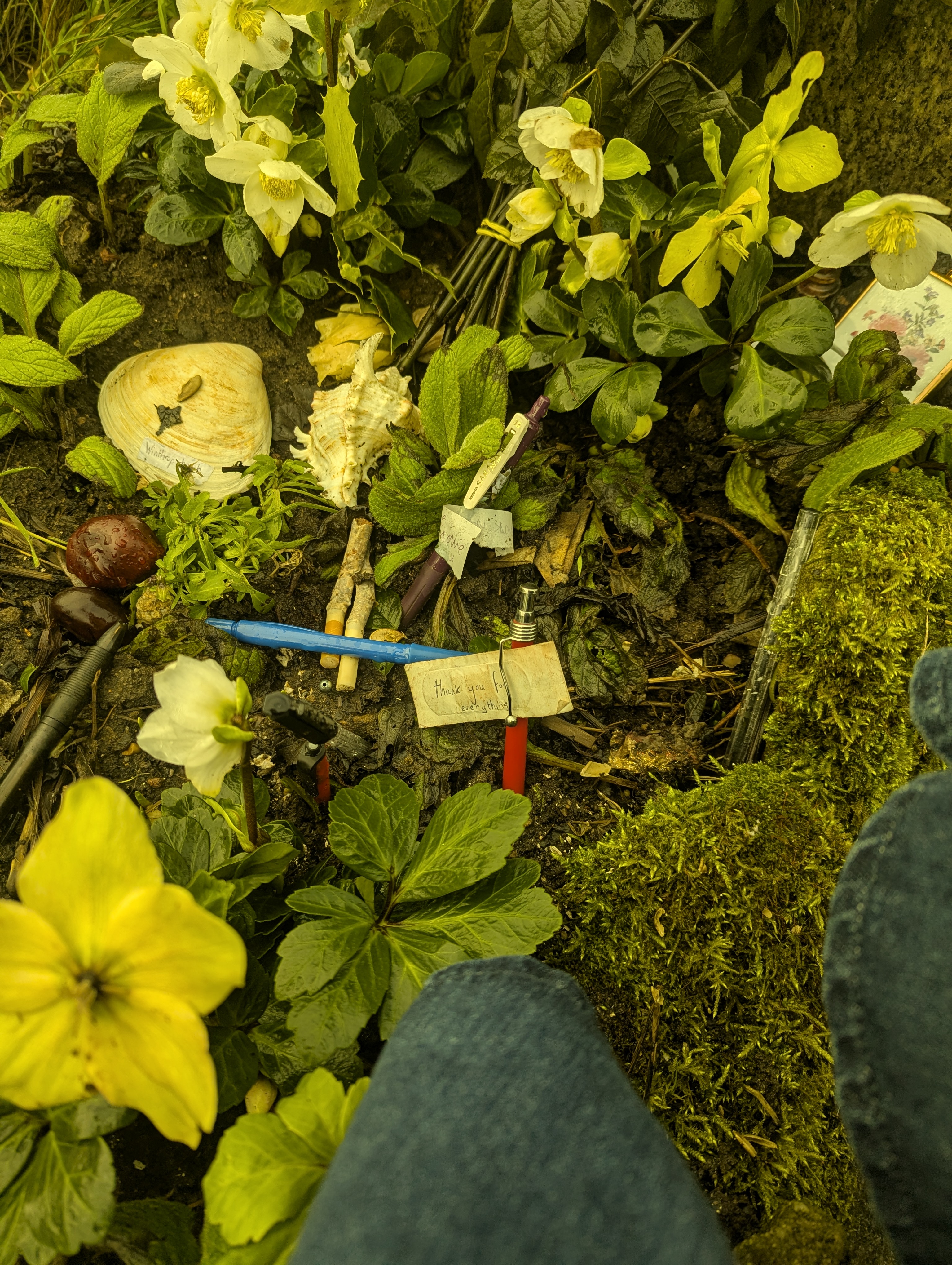 I turned away from the steep, tempting steps and instead kept on walking upwards. When I finally got to Heptonstall, a sheltered seated bus stop shone ahead like a mirage in very cold, winter desert. After sitting to catch my breath, I ate a Babybel, squished the red wax into my breast pocket with icy fingers, sipped some water from my flask and wandered down a winding cobblestone path towards the graveyard. I left a red pen for Sylvia. I wrote ‘thank you for everything’ on the wrappings of a peeling plaster, because I had left my notebook at home. I wrapped the plaster around the pen and pressed it into the earth alongside the many others. A home of pennies were scattered across the top of her tomb. As I added one to it, I felt a safety with her, if only for a moment. I felt a bit lighter, a bit like she was cradling me.